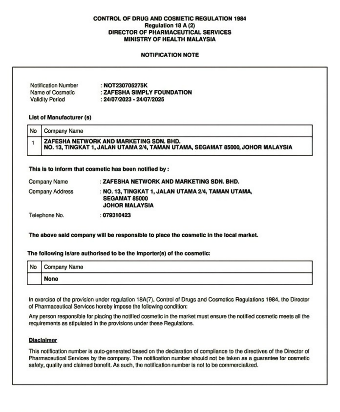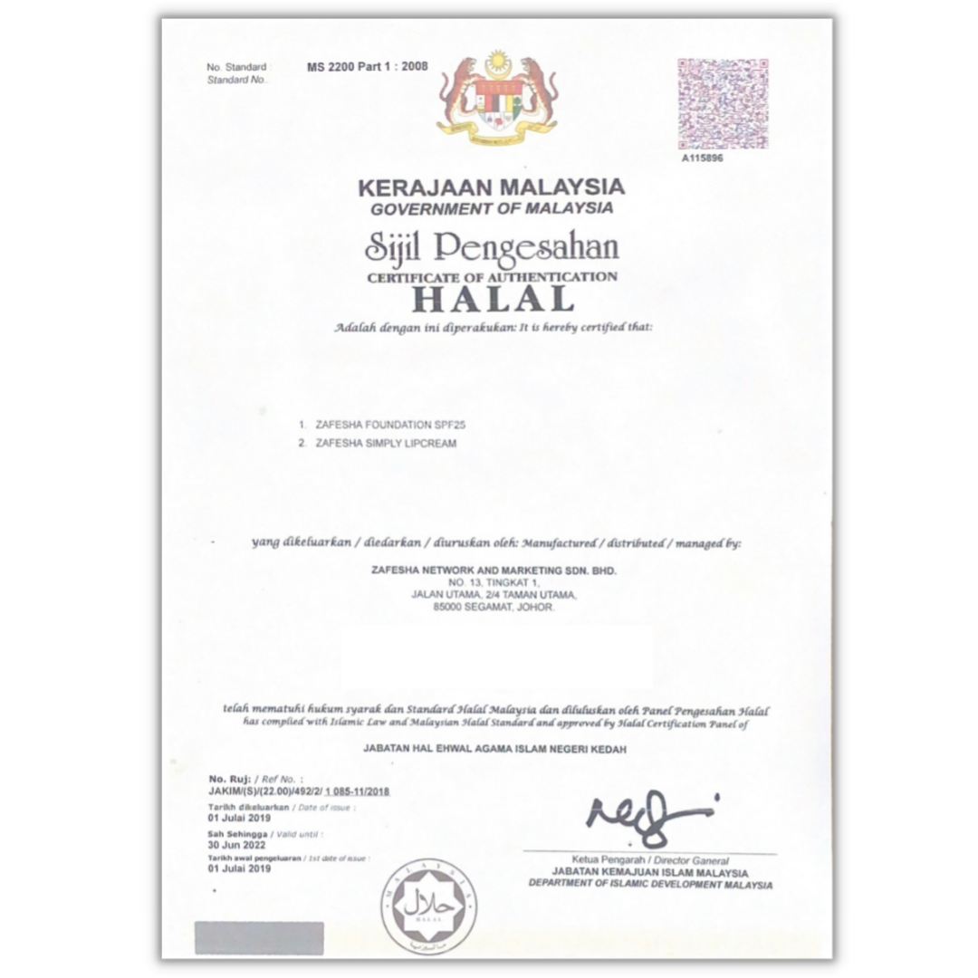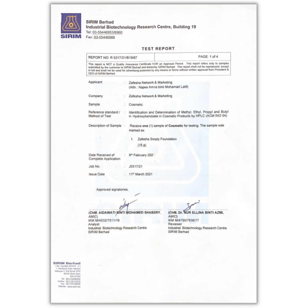 Krim Foundation Zafesha Juga Mempunyai Kelulusan Ujian Bahan Kimia Dari Sirim
