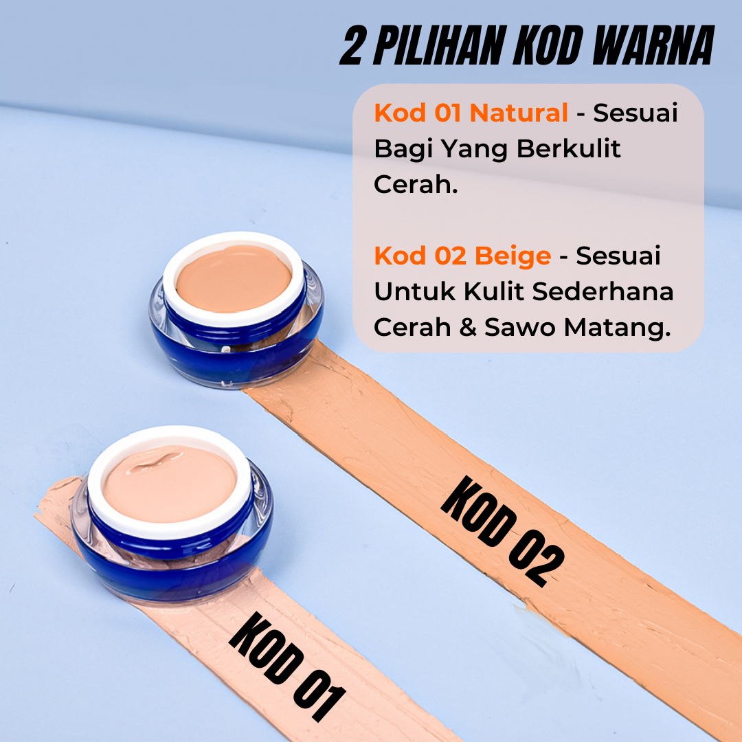 Pilih krim foundation yang sesuai dengan warna kulit. Akak boleh membuat pilihan 2 kod warna, Kod 01 sesuai untuk jenis kulit cerah manakala Kod 02 sesuai untuk jenis kulit sawo matang.